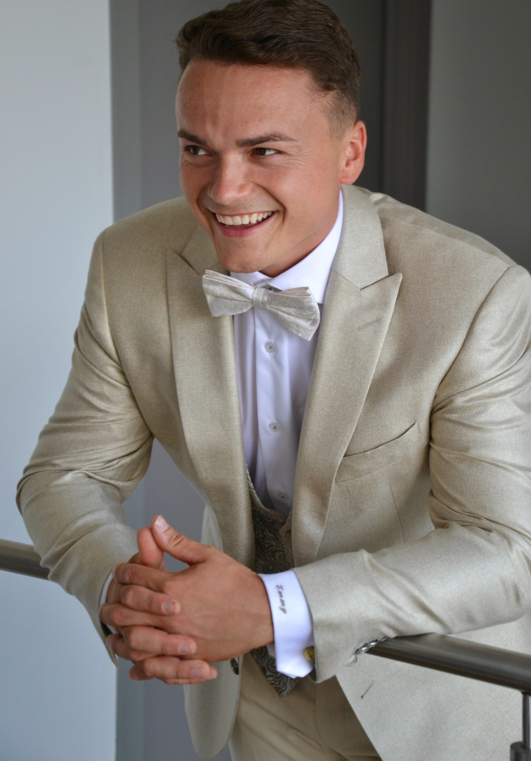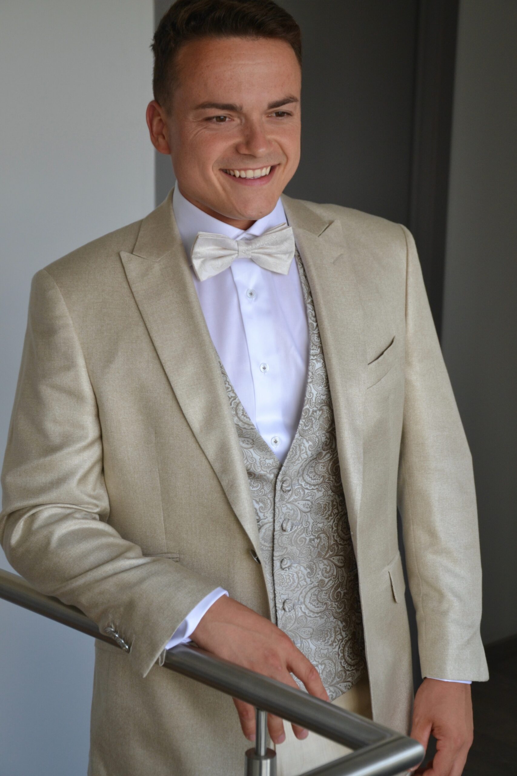 Trouwen in een beige kostuum op maat geeft een frisse stijlvolle uitstraling. Perfect voor zomers bruiloften. De combinatie van de effen blazer en broek met de gedessineerde gilet zorgt voor een mooi contrast en een vleugje luxe. De satijnen vlinderdas maakt het geheel compleet en voegt een klassieke touch toe.
