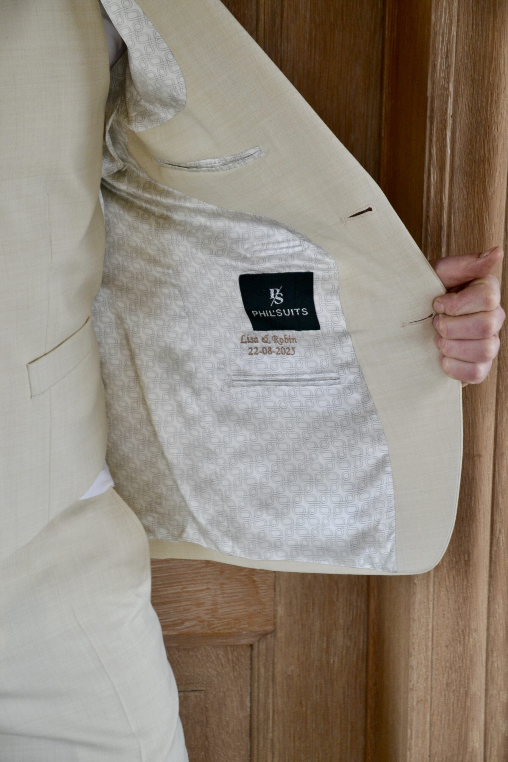 Dit 3-delig trouwkostuum op maat in zachte, natuurlijke tinten straalt rust en klasse uit.