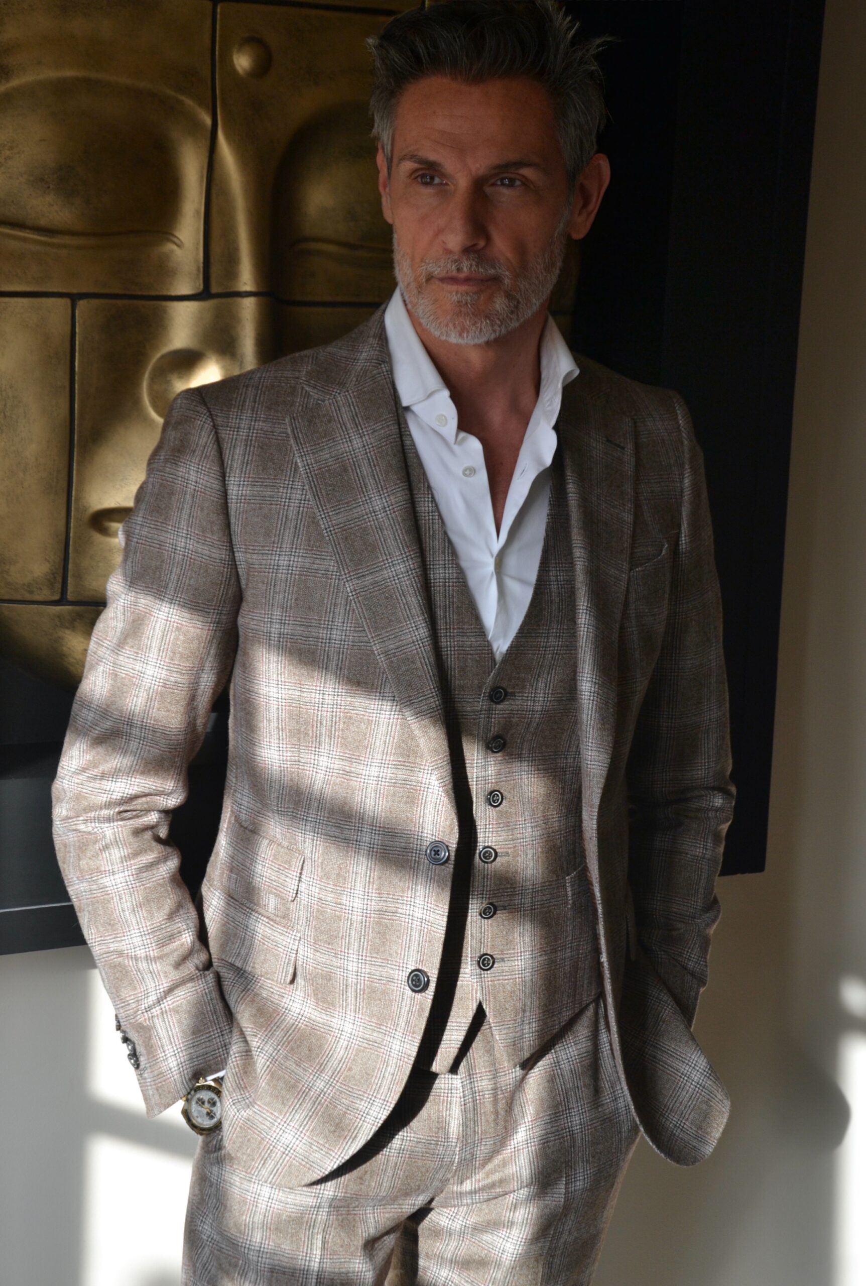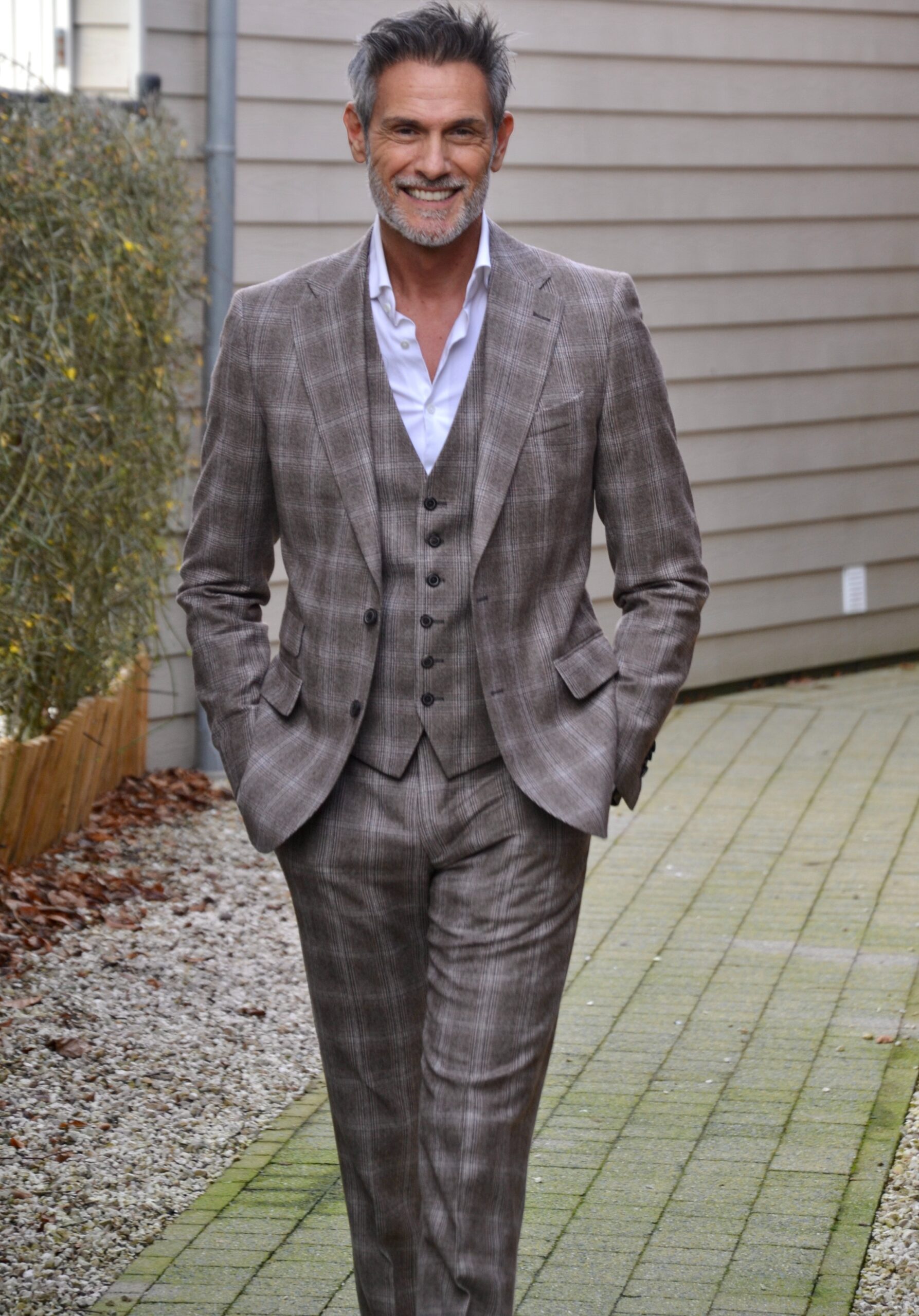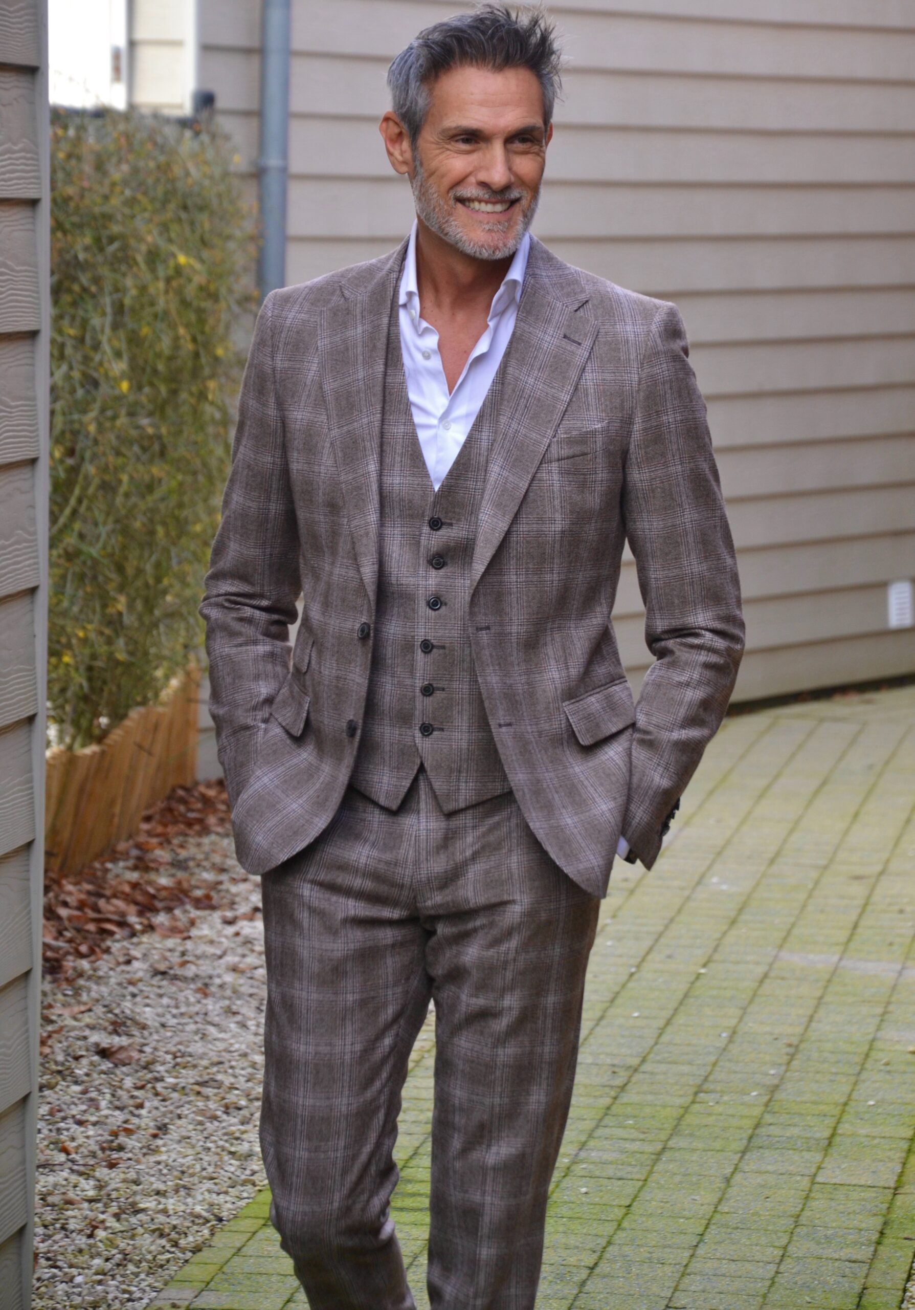 Voor Jadranko heb ik een 3-delig geruit kostuum op maat mogen maken die modern, elegantie en klasse uitstraalt. De warme aardetinten en het subtiele uitpatroon geven diepte en karakter. De gilet voegt extra klasse toe en maakt het pak veelzijdig van formeel tot smart casual.