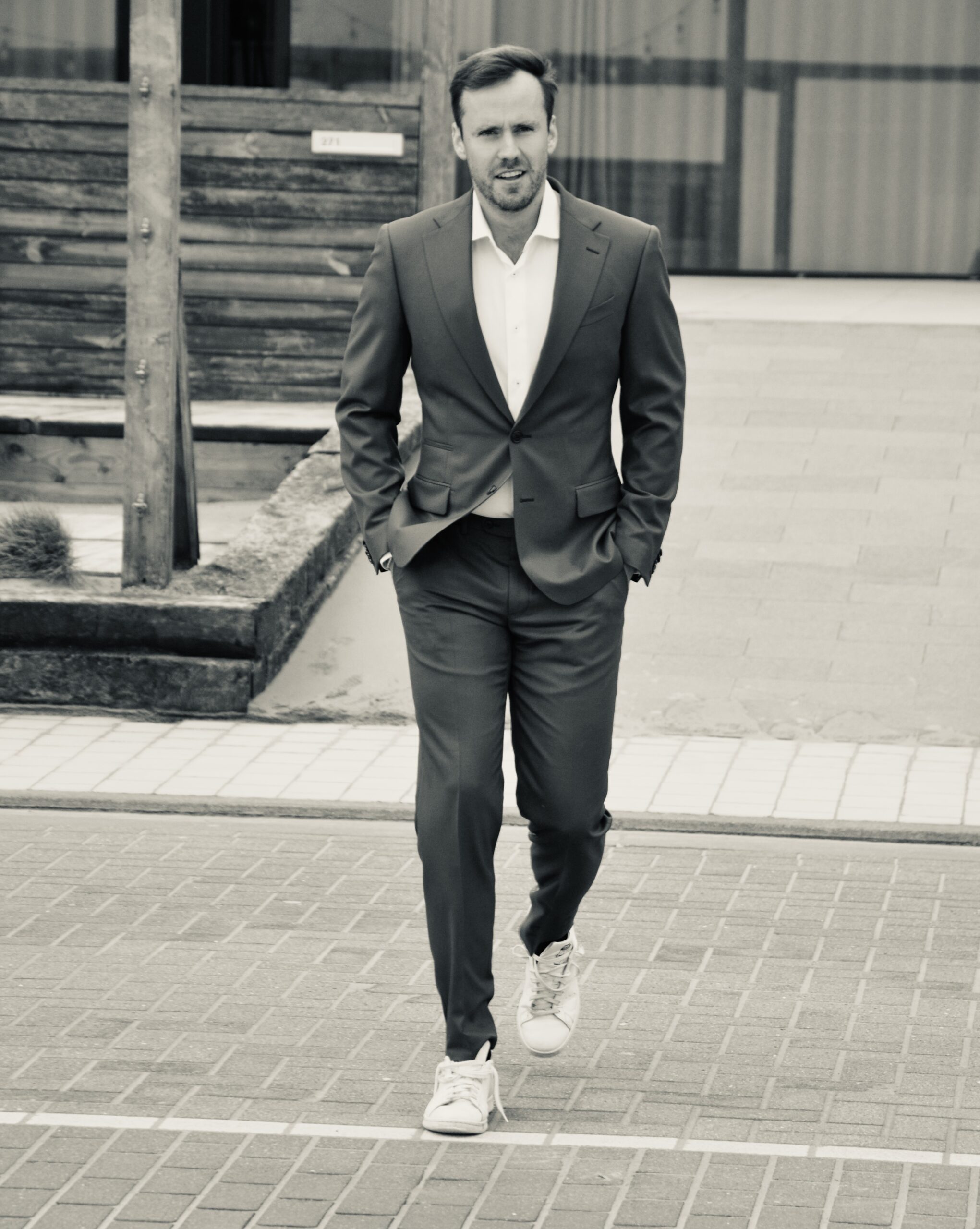 Felix doet dit met zijn kaki groen kostuum op maat met kleurrijke binnenvoering en passend wit hemd op maat.