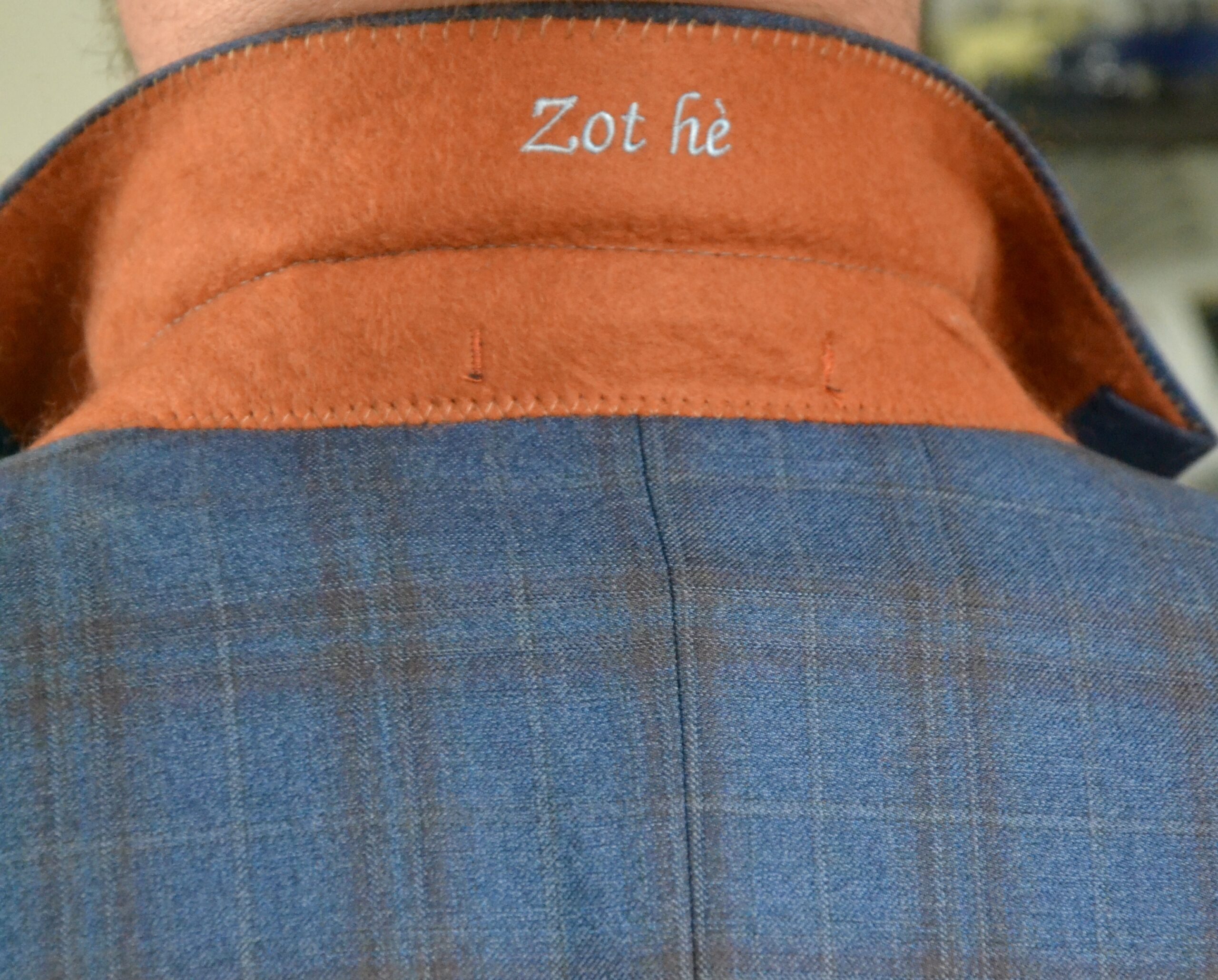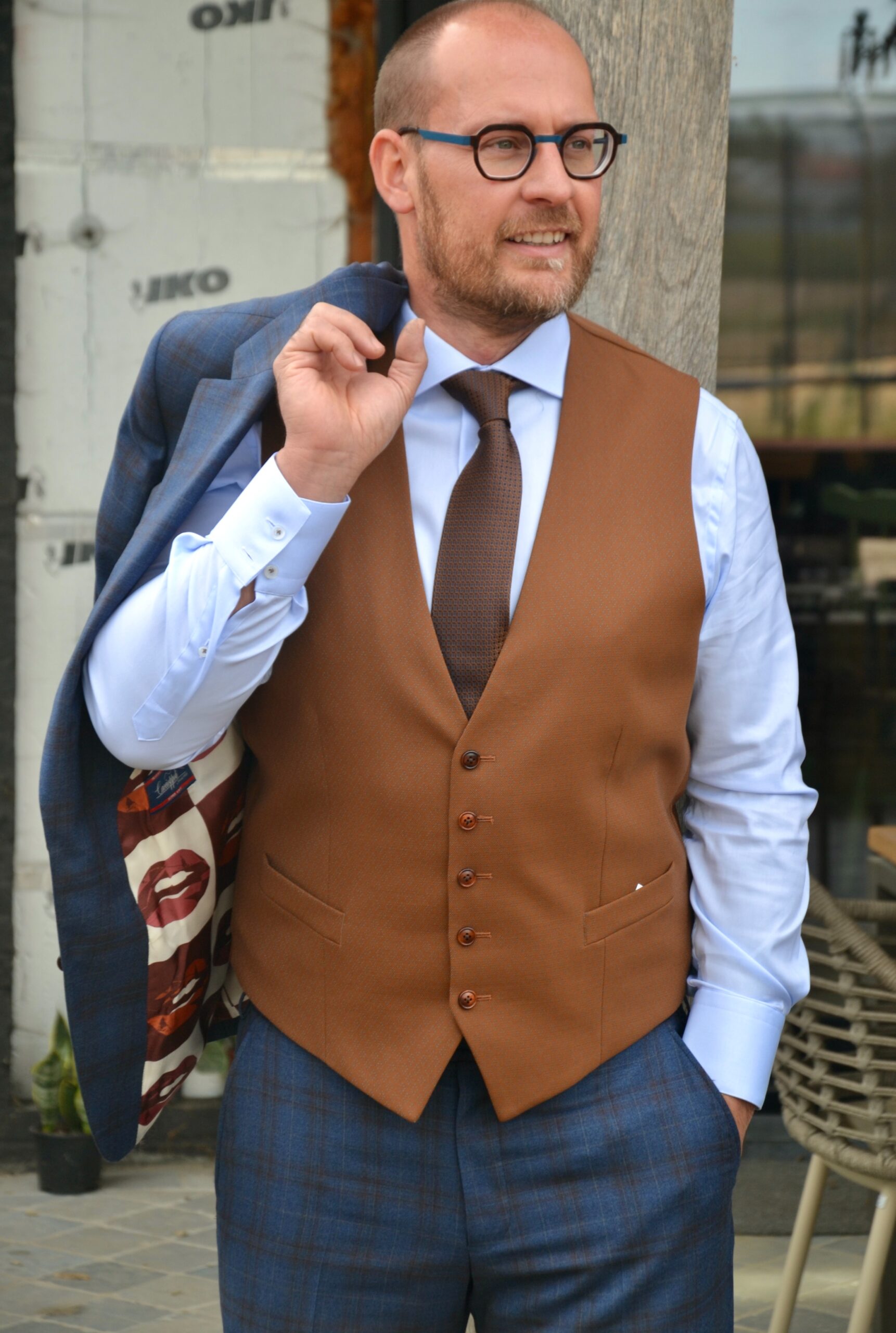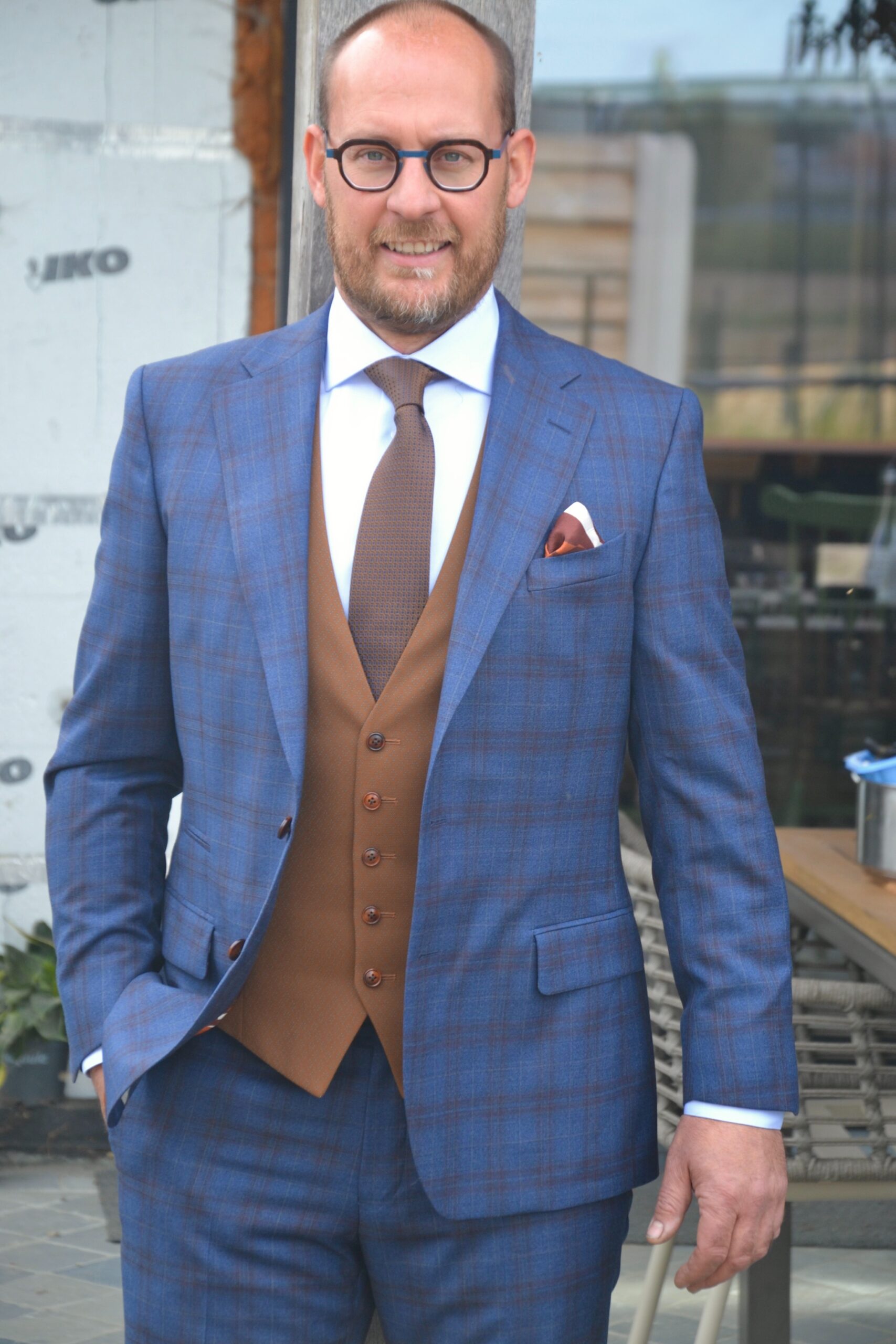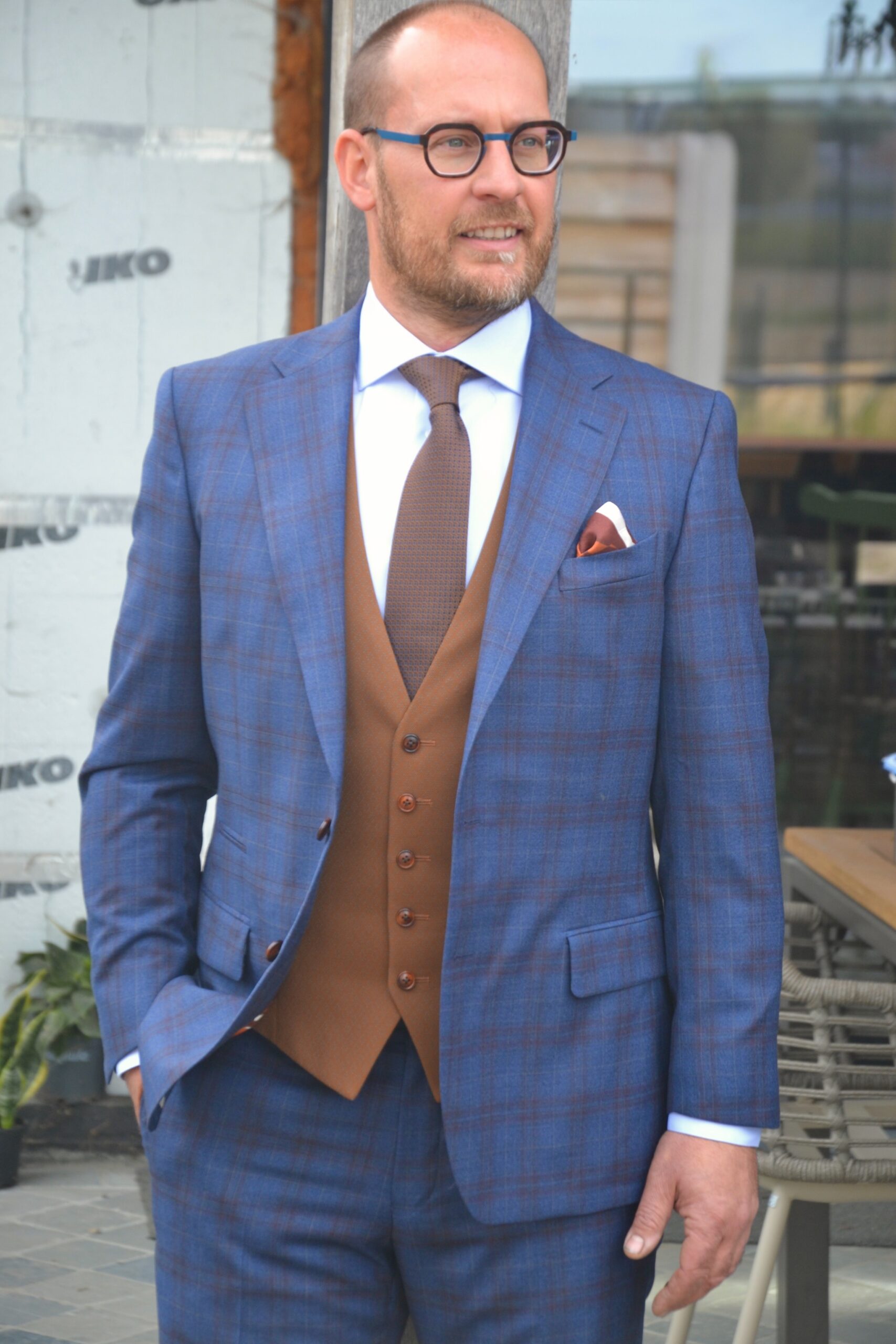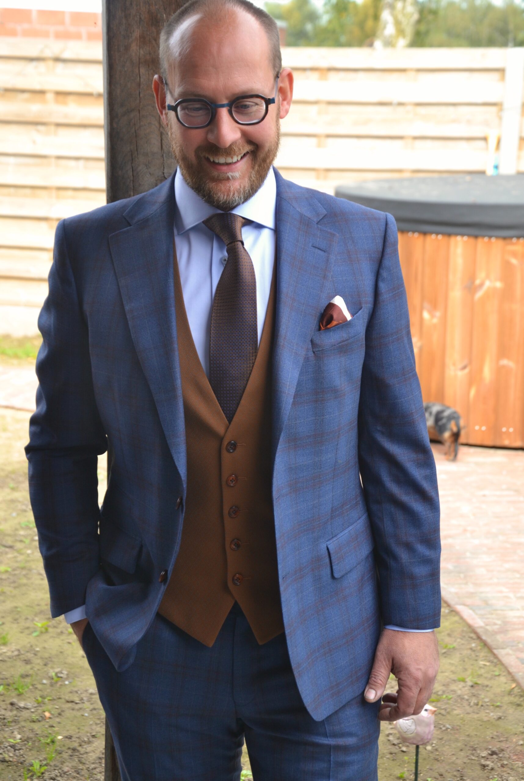 Voor Pascal heb ik een 3-delig trouwkostuum op maat mogen maken in een blauwe ruit stof met bruin contrast gilet, passend wit hemd op maat met bijhorende das. De binnenvoering zijn lips die het trouwpak een speelse touch geven.